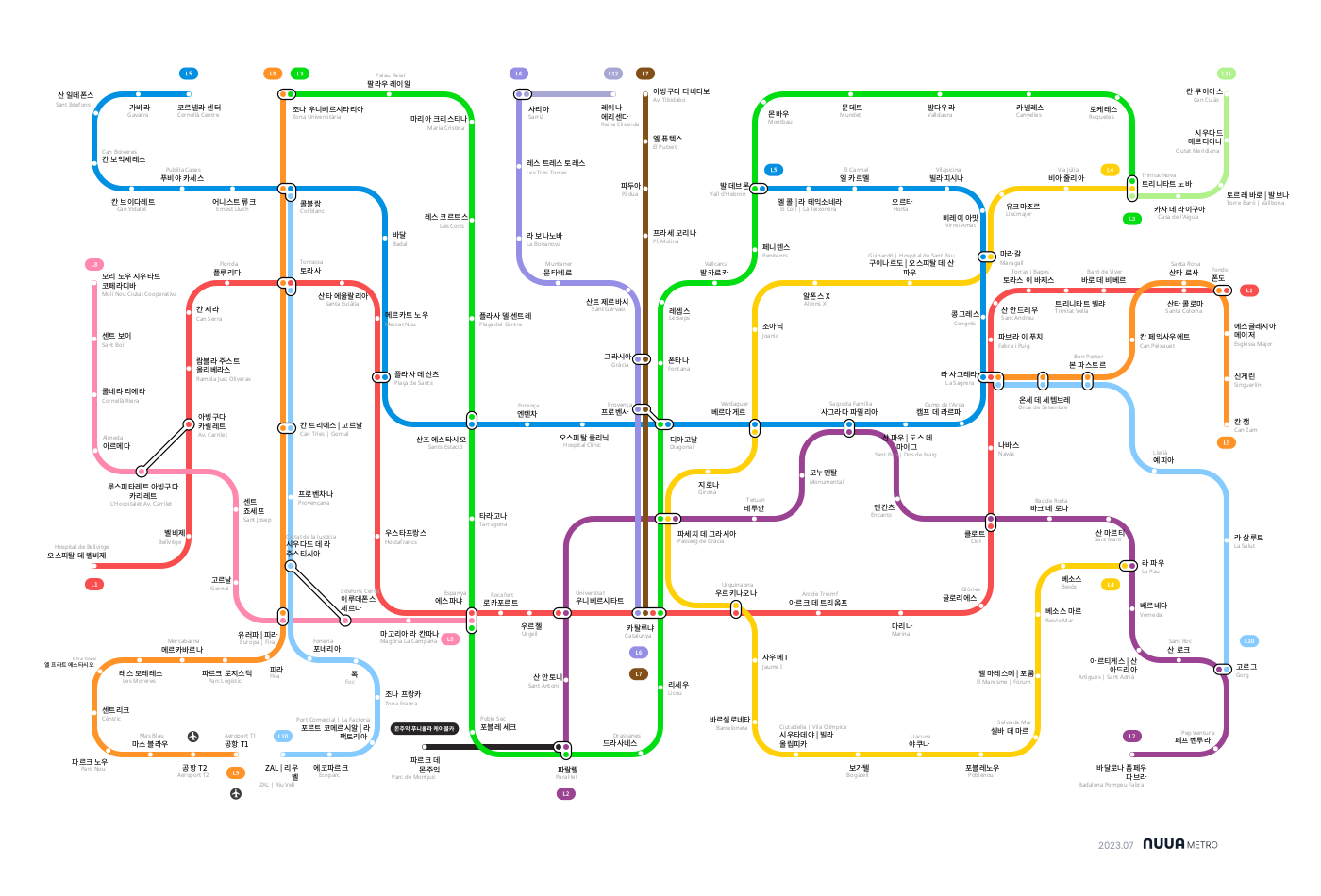 - L2 (퍼플): Paral·lel에서 Badalona Pompeu Fabra까지.